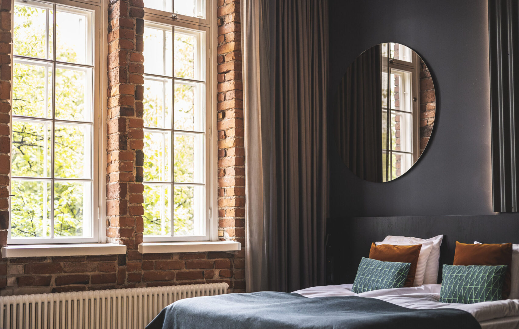 • Mies katsomassa ulos ikunasta Folks Hotels Konepajan upeasta huoneesta. Taustalla näkyy Konepajan aluetta.