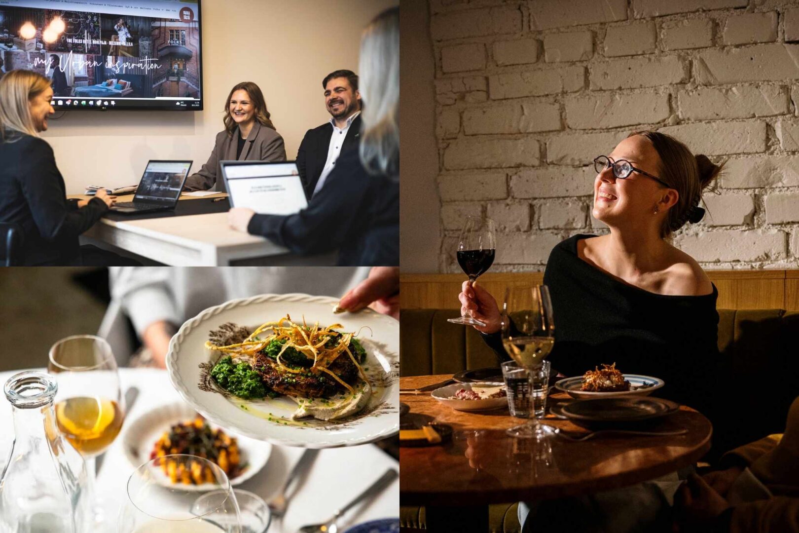 • Kollaasi erilaisista kuvista, jossa näkyy The Folks Hotel Konepajan huoneita, sauna sekä ravintola Albina
